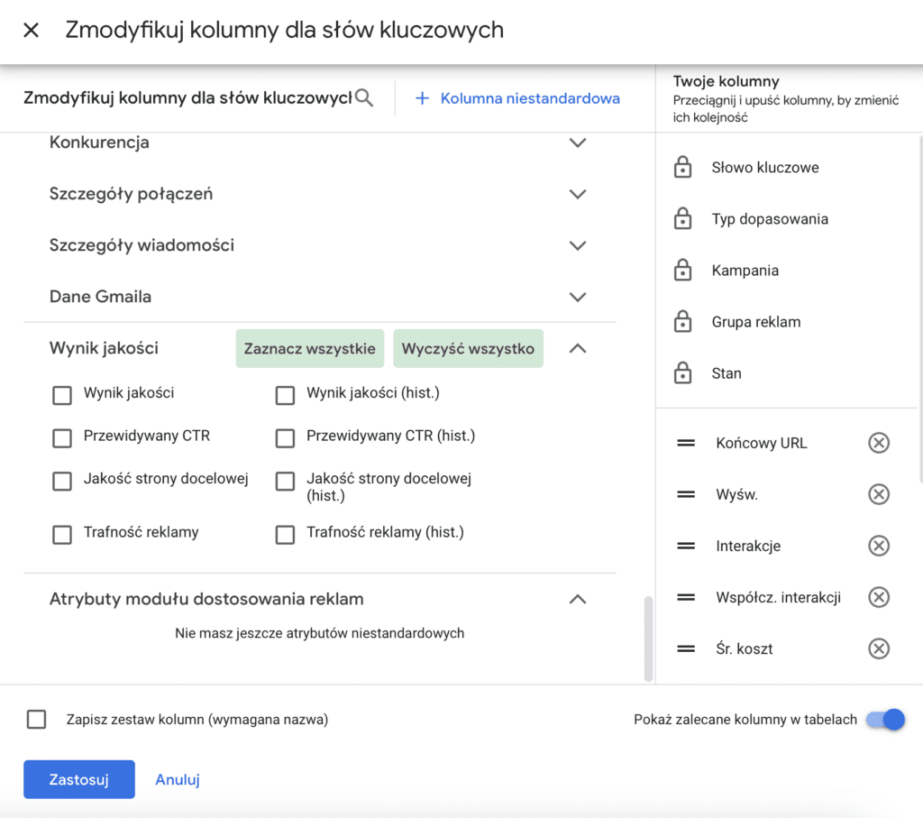 Aby dotrzeć do kolumn z wynikami jakości przejdź do zakładki „Słowa kluczowa” a następnie kliknij w zakładkę „Kolumny”. Tam znajdź sekcję zatytułowaną „Wynik jakości” i zaznacz wszystkie elementy, które chcesz poddać analizie.